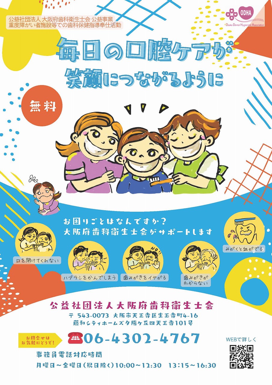 大阪府歯科衛生士会では、障がい児、障がい者の方々の口腔衛生を維持するための口腔衛生指導や歯みがき指導を行っています。